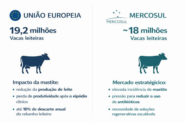 O mercado de gado leiteiro da União Europeia (UE) conta com aproximadamente 19,2 milhões de vacas leiteiras, enquanto nos países do Mercosul (Brasil, Argentina, Uruguai e Paraguai) a população total é de 19 a 20 milhões de cabeças. Isso significa que ambas as regiões representam uma escala de produção de leite comparável e constituem um dos maiores mercados lácteos integrados do mundo.